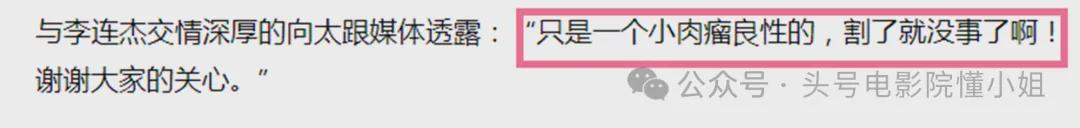 向太还对外透露了李连杰的入院手术具体情况,称“只是一个小肉瘤良性的,割了就没事了啊!谢谢大家的关心。”